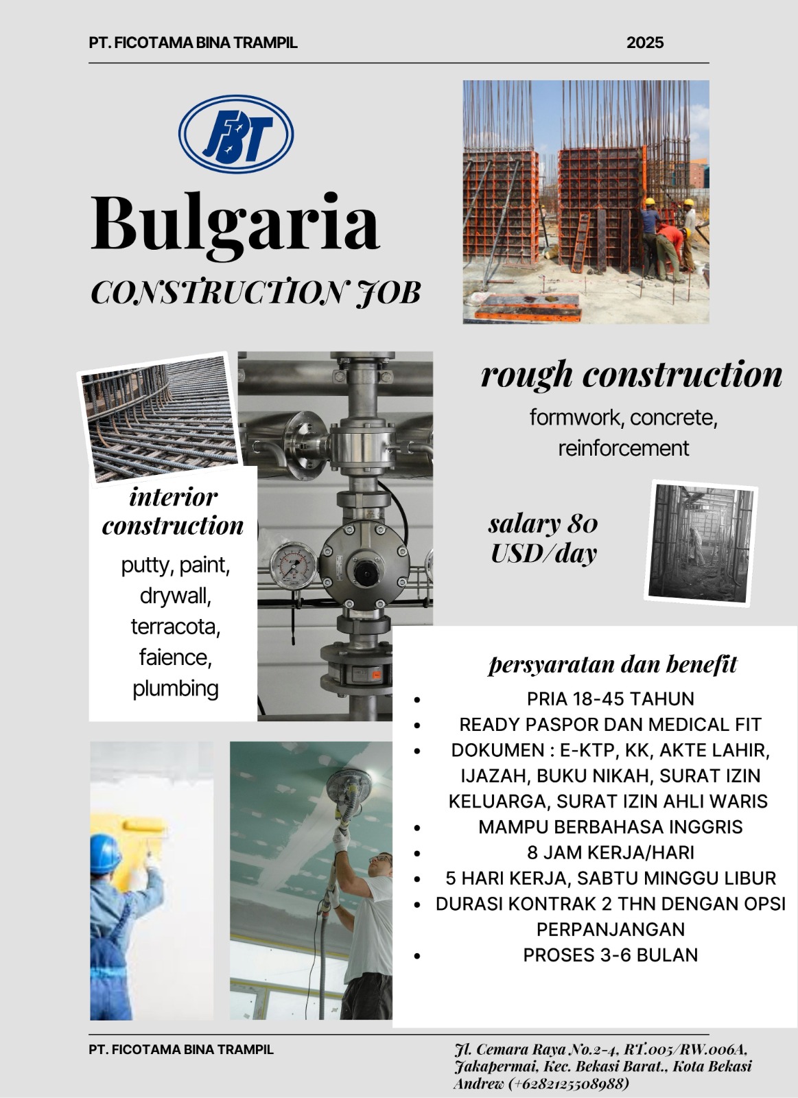 Our client in Bulgaria calls for Indonesian Talented Worker for Construction Industry in several department: